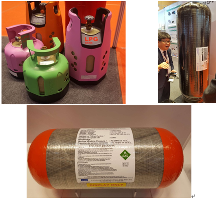 另外,韩国的POLYMER WORLD CO.,LTD、英国的R-TECH服务公司、韩国ENC国际公司等同时展示了LNG、LPG以及Ⅳ型瓶(氢燃料气瓶)的解决方案。随着新能源车轻量化的要求,动力来源的多样化,氢燃料新能源车将是汽车工业发展的重要方向。氢燃料气瓶为了自身减重,也将原设计的钢内胆、铝内胆,改成了热塑性HDPE内胆,进一步降低了重量,压力可达30Mpa以上。该气瓶已经应用于日本丰田与韩国现代氢燃料动力车。