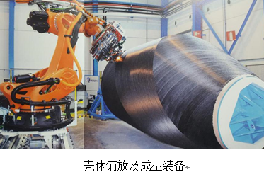 西班牙的M’TORRES公司生产的壳体铺放与成型装备通过在机械臂上安装碳纤维纱线或预浸带滚筒,实现多维度的铺放和辊压,通过红外照射实现固化。主要用于航空航天大型壳体的制造,如飞机机头等。该设备具有自动化程度高、多角度铺放、铺放精准、张力稳定、铺放与固化同时进行,效率高等特点。目前该设备已经面向中国销售。