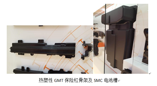 汽车轻量化方面,主要以韩华为代表的GMT汽车前端模块、门内板、电池槽壳体等。以连续纤维热塑片材(CFRTP)模压与注塑相结合的结构板是多种工艺融合的体现,同时发挥了CFRTP的表面层高强度、高抗冲性和注塑加强筋的结构性;规避了CFRTP的工艺难度和注塑制品强度不足的问题。