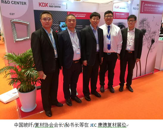 中国复合材料工业协会会长/胜利新大实业集团有限公司董事长吴永太、中国玻璃纤维工业协会秘书长刘长雷及中国复合材料工业协会秘书长张荣琪、副秘书长陶佳栋先生应邀出席了开幕式,并参观了展会。展会期间,协会和JEC进行了会谈。JEC的业务范围包括展会和信息交流平台,其深层次的信息交流平台,通过信息数据与互联网的应用,把上下游产业链有机的结合起来,进行信息的传递,并获取相应的收益。目前JEC展会与国内展会主要的区别是,JEC展示的是更高端、高科技、高技术含量的材料、技术和装备等;而国内的展会以原材料为主,复合材料技术领域的内容较为低端,这也是中国复合材料与国际复合材料的差距。双方交谈过程中,JEC方介绍了JEC展会的发展历程,以及近两年逐步由全球各地区的综合性展览向应用领域或者复合材料技术专业性展览转型的变化;同时,更加注重开展信息数据的收集和交流,成为其网络平台的重点。双方探讨了中国复合材料行业的技术现状和行业概况,并对未来合作的空间及可行性进行了探讨和展望。