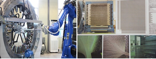 韩国T4L开发了一种三维径向编织机。该设备可以实现三根或更多根纱线交叉编织,在心轴上形成无缝编织物预制件,织物的互锁纤维具有优异的扭转强度和抗冲击性。通过最小的张力变化和纱线内部相互作用来减小摩擦,从而减少了纱线的损伤。