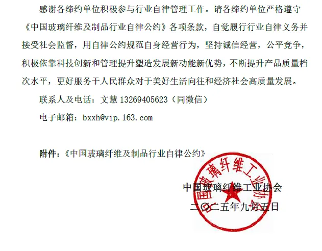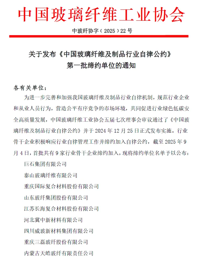 为进一步完善和加强我国玻璃纤维及制品行业自律机制,规范行业企业和从业人员行为,营造公平有序竞争的市场环境,共同促进行业绿色低碳安全高质量发展,中国玻璃纤维工业协会五届七次理事会审议通过了《中国玻璃纤维及制品行业自律公约》并于2024年12月25日正式发布实施。行业骨干企业积极响应行业自律管理工作并缔约加入自律公约,截至2025年9月4日,首批共有9家行业骨干企业缔约加入,现将缔约单位名单予以公布: