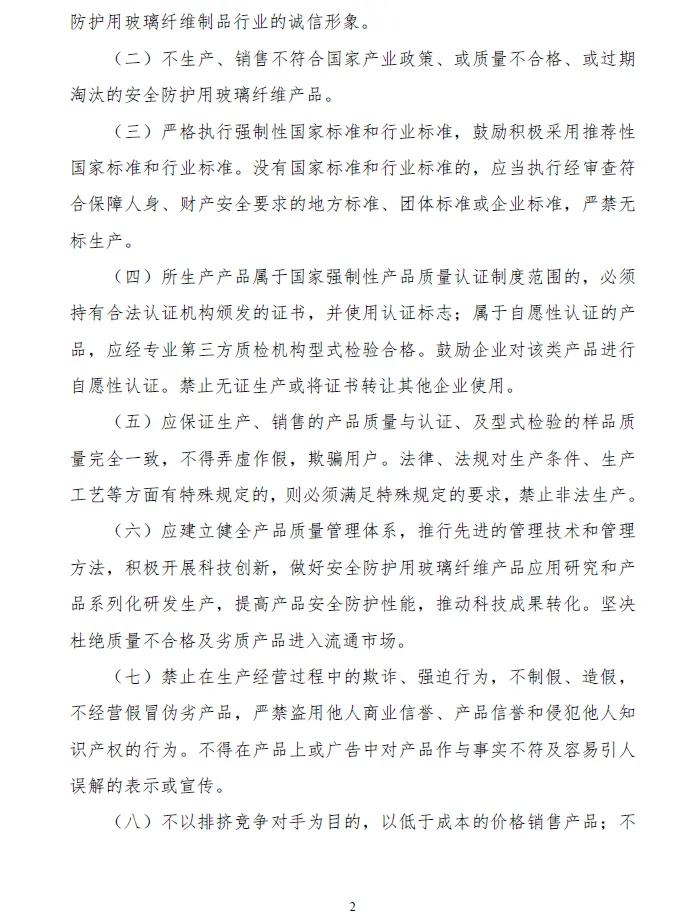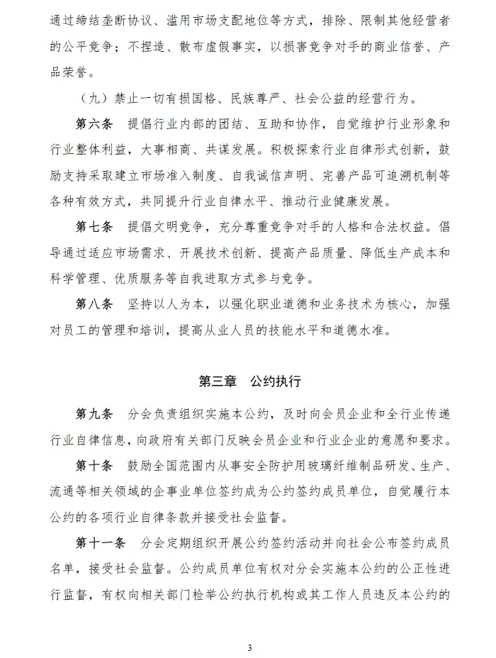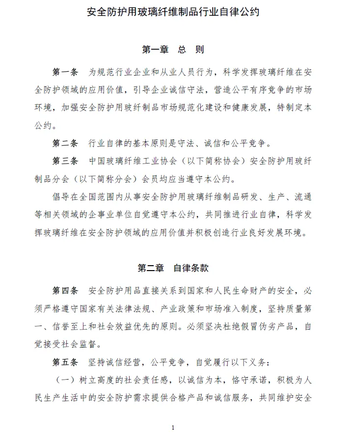 为规范行业企业和从业人员行为,科学发挥玻璃纤维在安全防护领域的应用价值,推动安全防护用玻纤制品市场规范化建设和健康发展,中国玻璃纤维工业协会安全防护用玻纤制品分会一届三次理事会审议通过了《安全防护用玻璃纤维制品行业自律公约》的议案,现正式予以发布,请各单位参照执行。同时,中国玻璃纤维工业协会面向分会全体会员及广大安全防护用玻纤制品从业单位征集《安全防护用玻璃纤维制品行业自律公约》缔约单位。