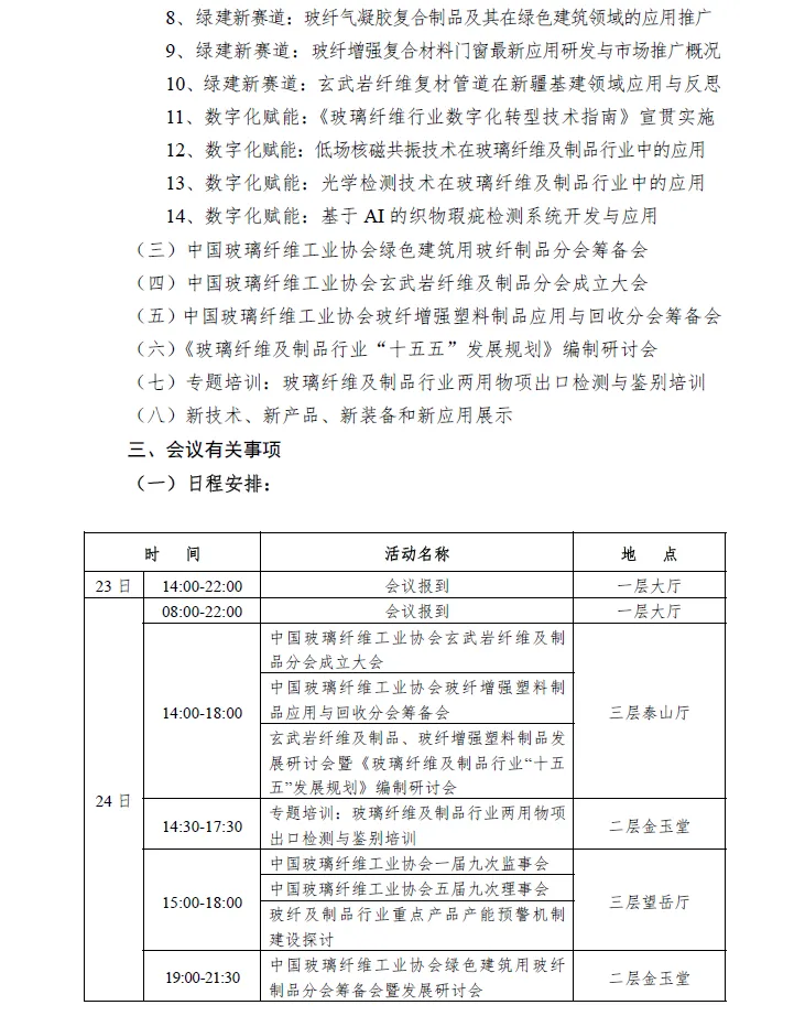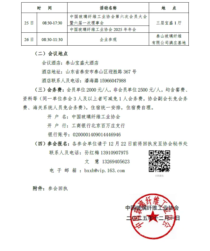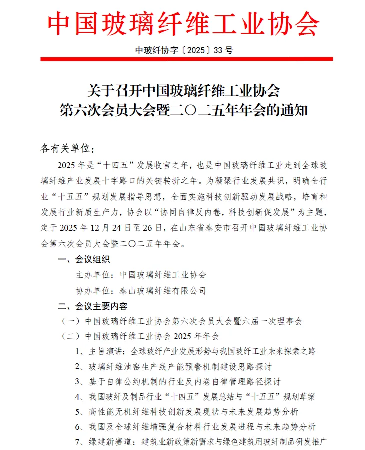 2025年是“十四五”发展收官之年,也是中国玻璃纤维工业走到全球玻璃纤维产业发展十字路口的关键转折之年。为凝聚行业发展共识,明确全行业“十五五”规划发展指导思想,全面实施科技创新驱动发展战略,培育和发展行业新质生产力,协会以“协同自律反内卷,科技创新促发展”为主题,定于2025年12月24日至26日,在山东省泰安市召开中国玻璃纤维工业协会第六次会员大会暨二〇二五年年会。具体事宜通知如下: