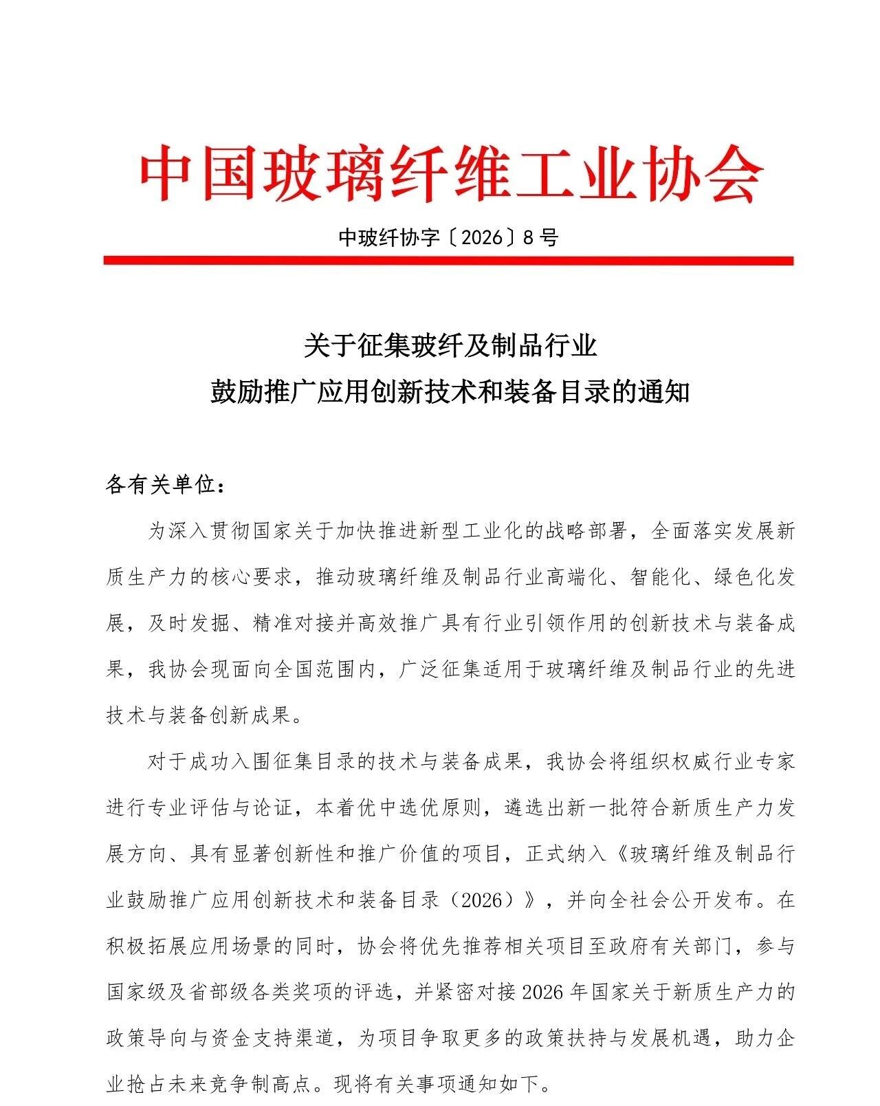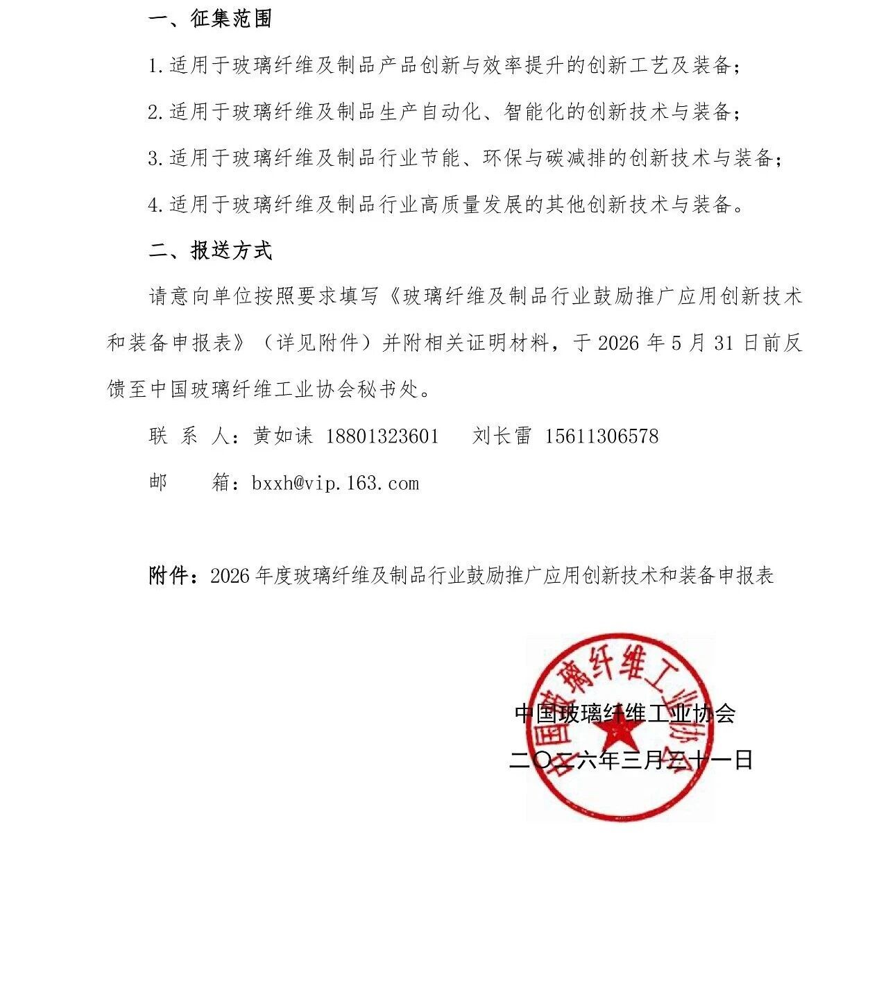 请意向单位按照要求填写《玻璃纤维及制品行业鼓励推广应用创新技术和装备申报表》(详见附件)并附相关证明材料,于2026年5月31日前反馈至中国玻璃纤维工业协会秘书处。
