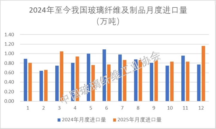 2025年1-12月,我国玻璃纤维及制品累计进口量为10.41万吨,同比上升0.8%;进口总额为11.91亿美元,同比上升32.9%。