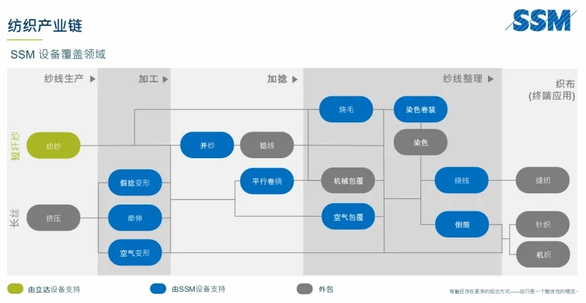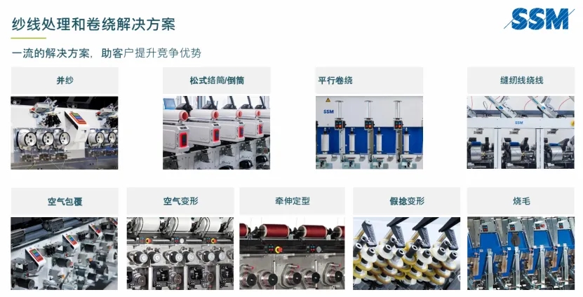 瑞士SSM公司(Scharer Schweiter Mettler AG),成立于1989年,由三家拥有300年历史的瑞士公司Scharer, Schweiter和Mettler合并而成。作为Rieter集团的子公司,SSM专注于生产用于染色卷装和缝纫线卷绕领域的精密络筒机,以及用于长丝纱线生产的纱线加工设备。在不同纤维材料(如涤纶/丙纶/锦纶/玻璃纤维)的空气变形领域占据市场地位,精密数码卷绕空气变形丝机可生产从30分特至>1200分特的纱支范围。